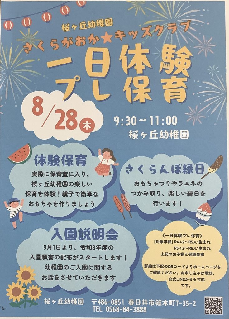 お友だちもお誘い合わせの上、皆さま、桜ヶ丘幼稚園に遊びに来てくださいね♪